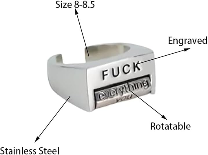 Feel free to unleash your rebellious side with this fun fucking mood ring from us at BERBIGET. Featuring a bold “Fu*k You Fu*k Everything” square letter design, this adjustable openwork ring embodies a gothic punk aesthetic.